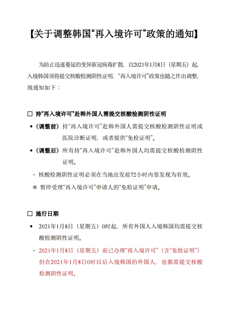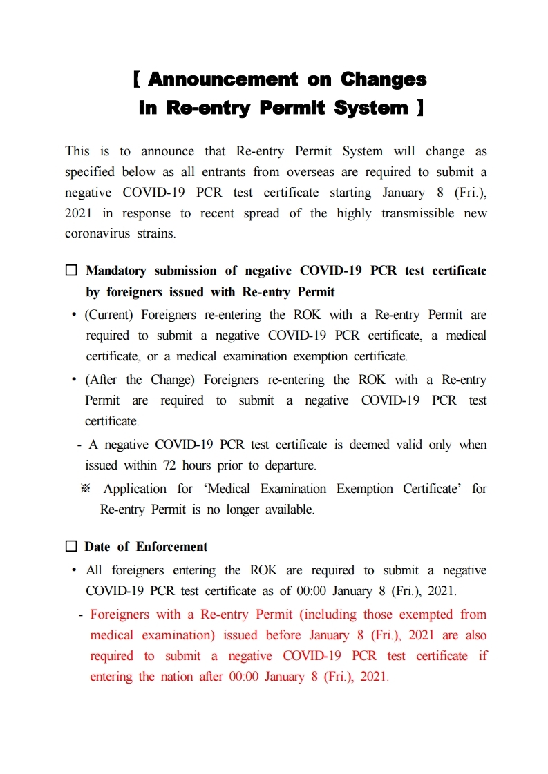ÃÖ±Ù ÀüÆÄ·ÂÀÌ ³ôÀº Äڷγª19 º¯ÀÌ ¹ÙÀÌ·¯½º È®»ê¿¡ ´ëÀÀÇÏ¿© `21. 1. 8.(±Ý)ºÎÅÍ ÇØ¿Ü ÀÔ±¹ÀÚ´Â ¹Ýµå½Ã PCR À½¼ºÈ®Àμ¸¦ Á¦ÃâÇÏ°Ô µÊ¿¡ µû¶ó, ÀçÀÔ±¹Çã°¡Á¦µµ¸¦ ¾Æ·¡¿Í °°ÀÌ º¯°æÇÔÀ» ¾Ë·Á µå¸³´Ï´Ù. ¡à ÀçÀÔ±¹Çã°¡¸¦ ¹ÞÀº ¿Ü±¹ÀÎÀÇ PCR À½¼ºÈ®Àμ Á¦Ãâ Àǹ«È • (ÇöÇà) ÀçÀÔ±¹Çã°¡¸¦ ¹Þ°í ÀçÀÔ±¹ÇÏ´Â ¿Ü±¹ÀÎÀº PCR À½¼ºÈ®Àμ ¶Ç´Â º´¿ø Áø´Ü¼¸¦ Á¦ÃâÇϰųª, Áø´Ü¸éÁ¦¼¸¦ Á¦Ãâ • (º¯°æ) ÀçÀÔ±¹Çã°¡¸¦ ¹Þ°í ÀçÀÔ±¹ÇÏ´Â ¿Ü±¹ÀÎÀº ¹Ýµå½Ã PCR À½¼º È®Àμ¸¦ Á¦Ãâ - PCR À½¼ºÈ®Àμ´Â Ãâ¹ß Àü 72½Ã°£ À̳» ¹ß±ÞµÈ È®Àμ¸¸ ÀÎÁ¤ ¡Ø ÀçÀÔ±¹Çã°¡ ½Ã ½ÅûÀÌ °¡´ÉÇß´ø `ÀçÀÔ±¹Çã°¡ÀÚÀÇ Áø´Ü¸éÁ¦¼` ½Åû ºÒ°¡ ¡à ½ÃÇàÀÏ • `21.1.8.(±Ý) 00½ÃºÎÅÍ ÀÔ±¹ÇÏ´Â ¸ðµç ¿Ü±¹ÀÎÀº PCR À½¼ºÈ®Àμ Á¦ÃâÇÏ¿©¾ß ÇÔ - `21.1.8.(±Ý) ÀÌÀü¿¡ ÀçÀÔ±¹Çã°¡(Áø´Ü¸éÁ¦ Çã°¡ÀÚ Æ÷ÇÔ)¸¦ ¹ÞÀº ¿Ü±¹Àεµ `21.1.8.(±Ý) 00½Ã ÀÌÈÄ¿¡ ÀÔ±¹ÇÒ °æ¿ì PCR À½¼º È®Àμ¸¦ Á¦ÃâÇÏ¿©¾ß ÇÔ. ³¡.