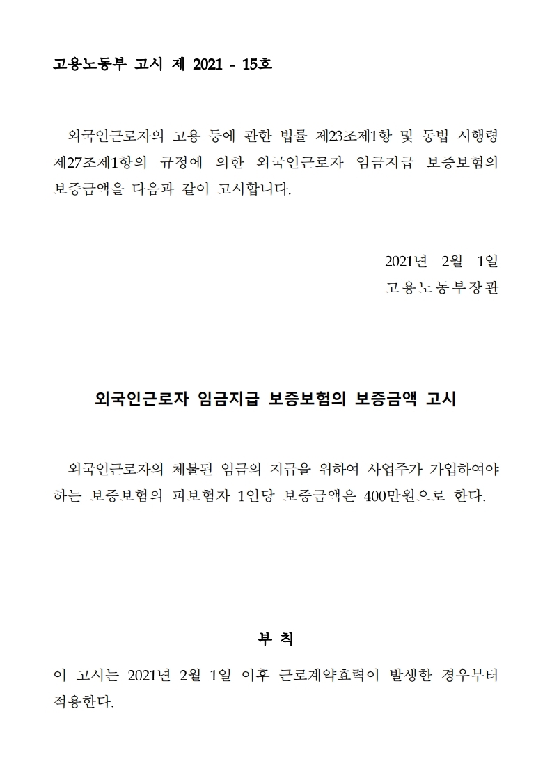 2¿ù 1ÀÏ ºÎ·Î ¿Ü±¹ÀαٷÎÀÚ ÀÓ±ÝÁö±Þ º¸Áõº¸Çè¾×ÀÌ 400¸¸¿øÀ¸·Î Áõ¾× µË´Ï´Ù.´Ü, 2021³â 2¿ù 1ÀÏ ÀÌÈÄ ±Ù·Î°è¾àÇÑ °æ¿ì Àû¿ëµË´Ï´Ù. |
